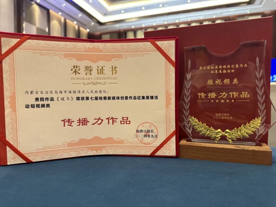 9月19日,由最高人民检察院新闻办公室指导的第七届检察新媒体创意作品征集展播暨优秀案例实训分享在江苏省常州市举行,经过网络投票、初评、复评、定评多个环节评选,5类奖项、100个获奖名单全部产生,并在会上进行了揭晓,其中乌海市海勃湾区人民检察院创作的:《暖冬》获评第七届检察新媒体创意作品征集展播活动短视频类传播力作品奖。